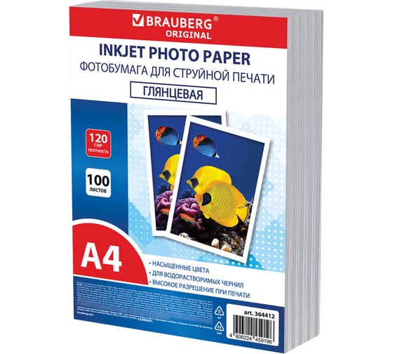 Фотобумага BRAUBERG глянцевая, А4, 120 г/м2, односторонняя, 100 листов, ПАКЕТ, ORIGINAL, 364412