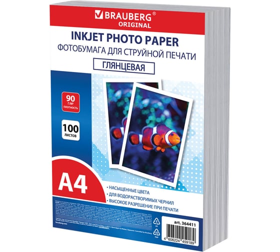 Фотобумага BRAUBERG глянцевая, А4, 90 г/м2, односторонняя, 100 листов, ПАКЕТ, ORIGINAL, 364411