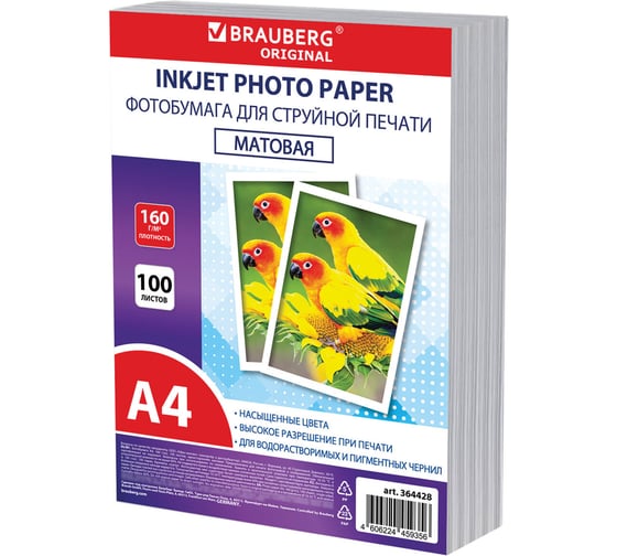Фотобумага BRAUBERG матовая, А4, 160 г/м2, односторонняя, 100 листов, ПАКЕТ, ORIGINAL, 364428