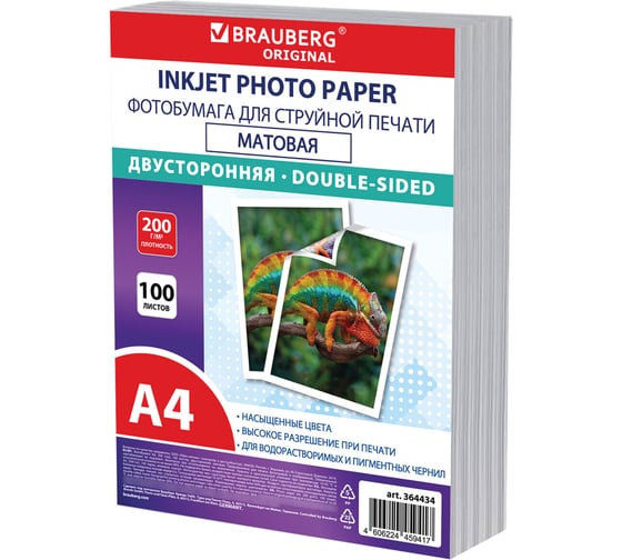Фотобумага BRAUBERG матовая, А4, 200 г/м2, двусторонняя, 100 листов, ПАКЕТ, ORIGINAL, 364434