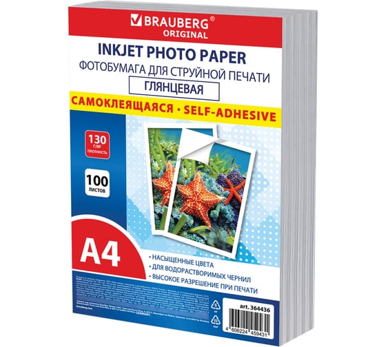 Фотобумага BRAUBERG самоклеящаяся, глянцевая, А4, 130 г/м2, 100 листов, ПАКЕТ, ORIGINAL, 364436