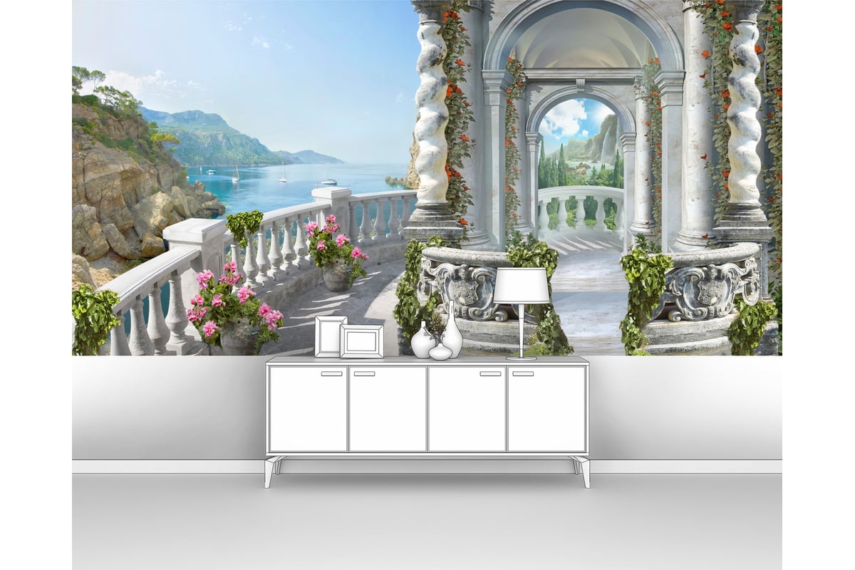 Фотообои "Белоснежная терраса с видом на море и горы" 200x100 ШxВ ООО Первое ателье pw28417
