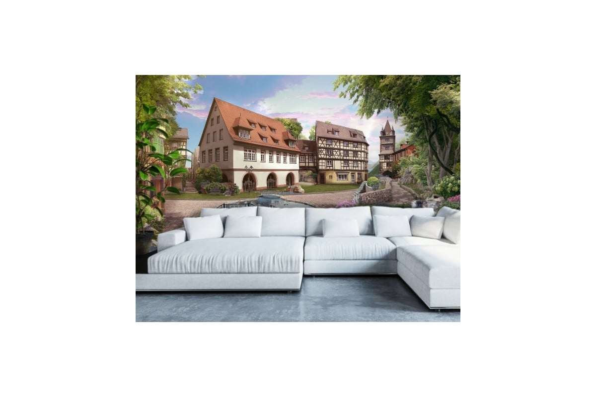 Фотообои DIVINO Вид на улицу с озером, 400x270 см T-059 предназначены для внутренней отделки помещений. Изготавливаются на флизелиновой основе путем нанесения цифровой печати на винил горячего тиснения.