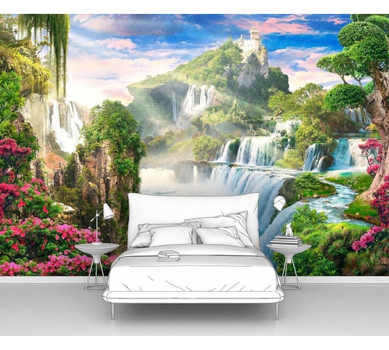 Фотообои ООО Первое ателье горы "Замок на горе с водопадами" 200x130 ШxВ pw70602-2 изготовлены путем нанесения оригинального авторского изображения на обойный материал, предназначенный специально для выпуска фотообоев.