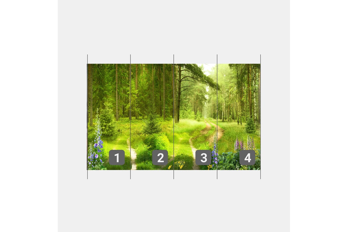 Фотообои ООО Первое ателье лес "Тропинка в лесу между сосен, елок и берез" 400x200 ШxВ pw78654 изготовлены путем нанесения оригинального авторского изображения на обойный материал, предназначенный специально для выпуска фотообоев.
