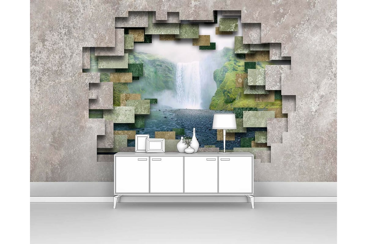 Фотообои ООО Первое ателье природа "Водопад в фигурном проломе" 200x120 ШxВ pw141411-2 изготовлены путем нанесения оригинального авторского изображения на обойный материал, предназначенный специально для выпуска фотообоев.