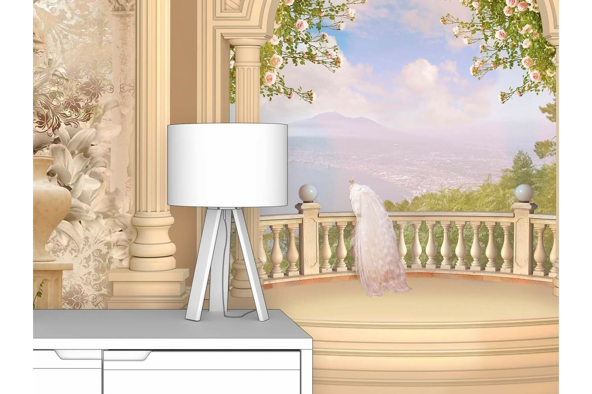 Фотообои ООО Первое ателье "Светлая терраса с белой птицей" 200x130 ШxВ pw28779-2 изготовлены путем нанесения оригинального авторского изображения на обойный материал, предназначенный специально для выпуска фотообоев.
