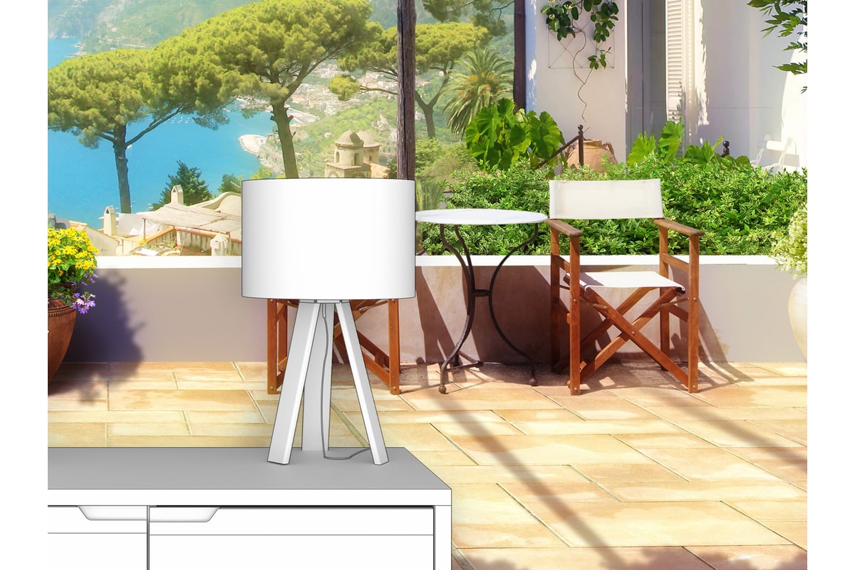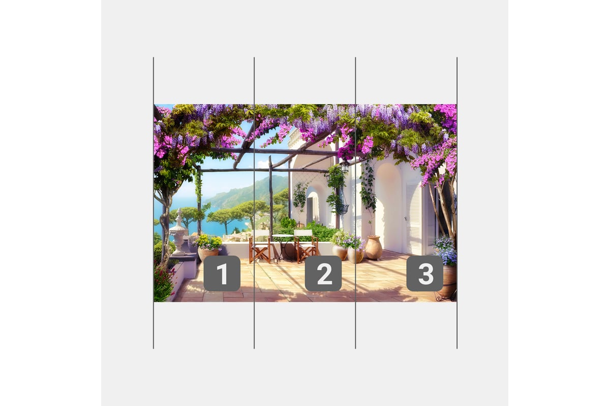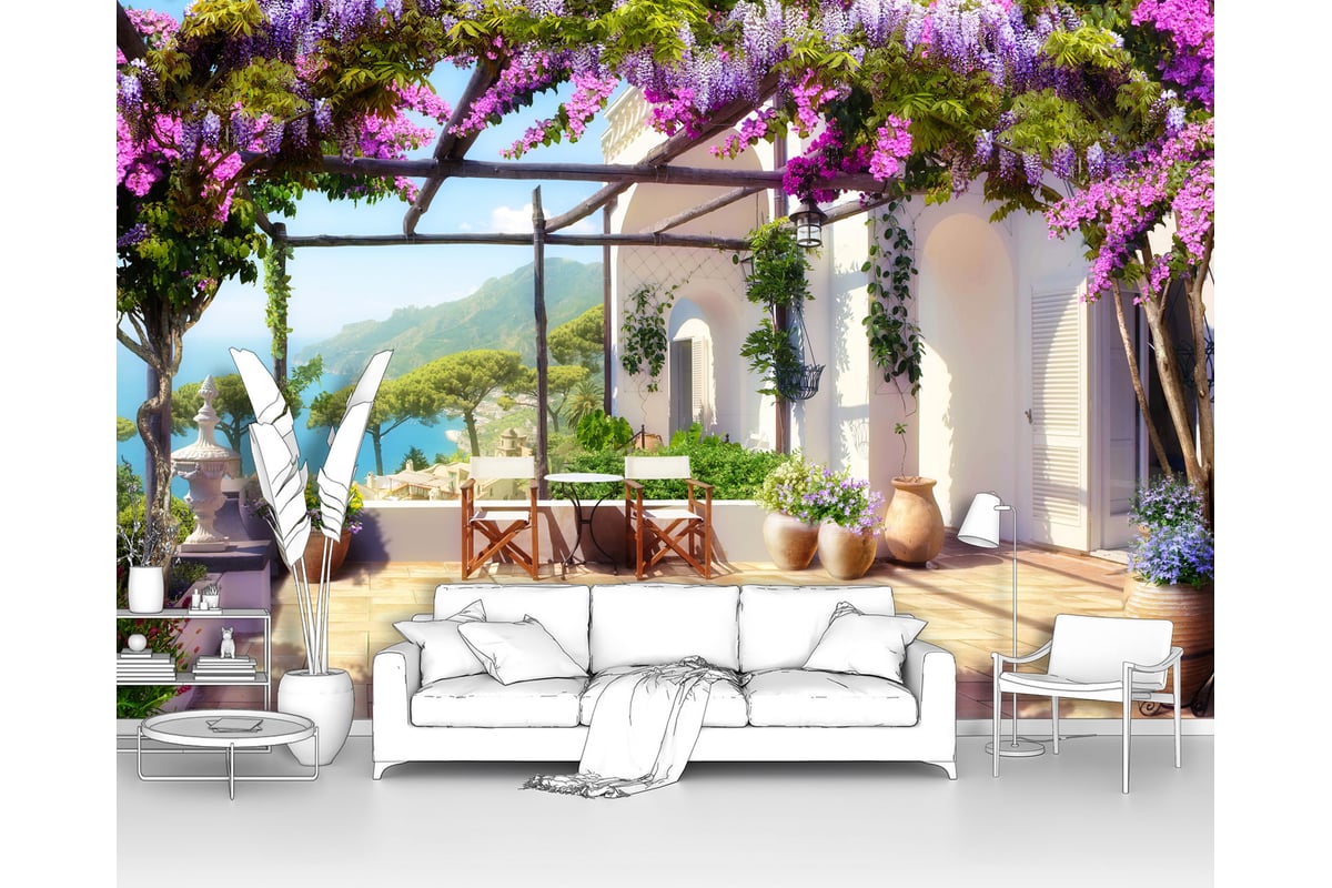 Фотообои ООО Первое ателье "Терраса под цветочной крышей" 300x195 ШxВ pw141258-3 изготовлены путем нанесения оригинального авторского изображения на обойный материал, предназначенный специально для выпуска фотообоев.