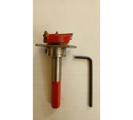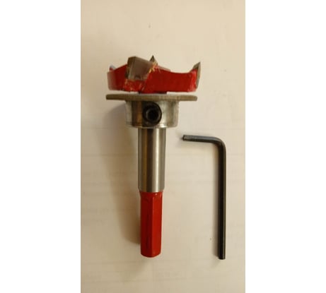 Сверло поставляется с шестигранником. Винт держит ограничитель крепко. На хвостовике гравировка в мм, что позволяет чётко выставлять глубину отверстия до 40 мм. Остриё короткое, что исключает продавливание лицевой стенки фасада. Биения отсутствуют. Победитовые пластины и наконечник острия после 20 отверстий в ламинированном МДФ не затупились, Стенки отверстий оставались ровными с первого до последнего отверстия. На хвостовике проточены две грани, что не даёт проскальзывать сверлу в патроне. Ограничитель неидеален, но функцию выполняет. Рекомендую к покупке. Своих денег стоит.