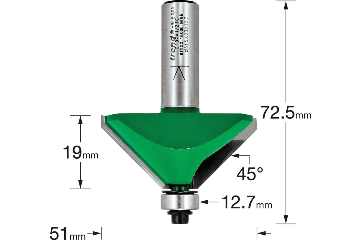 Фреза кромочная конусная (51х19х72,5 мм, 45 градусов, хвостовик 12,7 мм) по дереву TREND C197X1/2TC