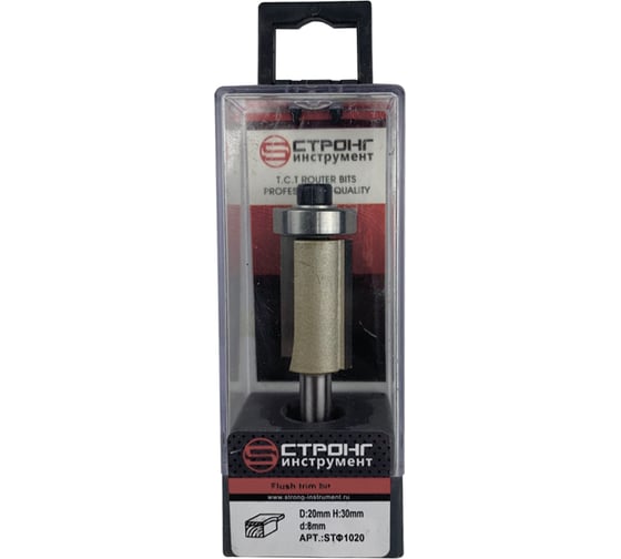Фреза по дереву кромочная прямая Z2, 8x20Dх30H мм Strong СТФ-10202030 имеет прочное стальное тело с заточенными твердосплавными режущими ножами, нижним подшипником и цилиндрическим хвостовиком под фрезерный станок. Подшипник ограничивает ход фрезы вглубь обрабатываемого материала, что повышает точность и обеспечивает чистоту выполнения работы. Устойчива к выщерблению по рабочей кромке.