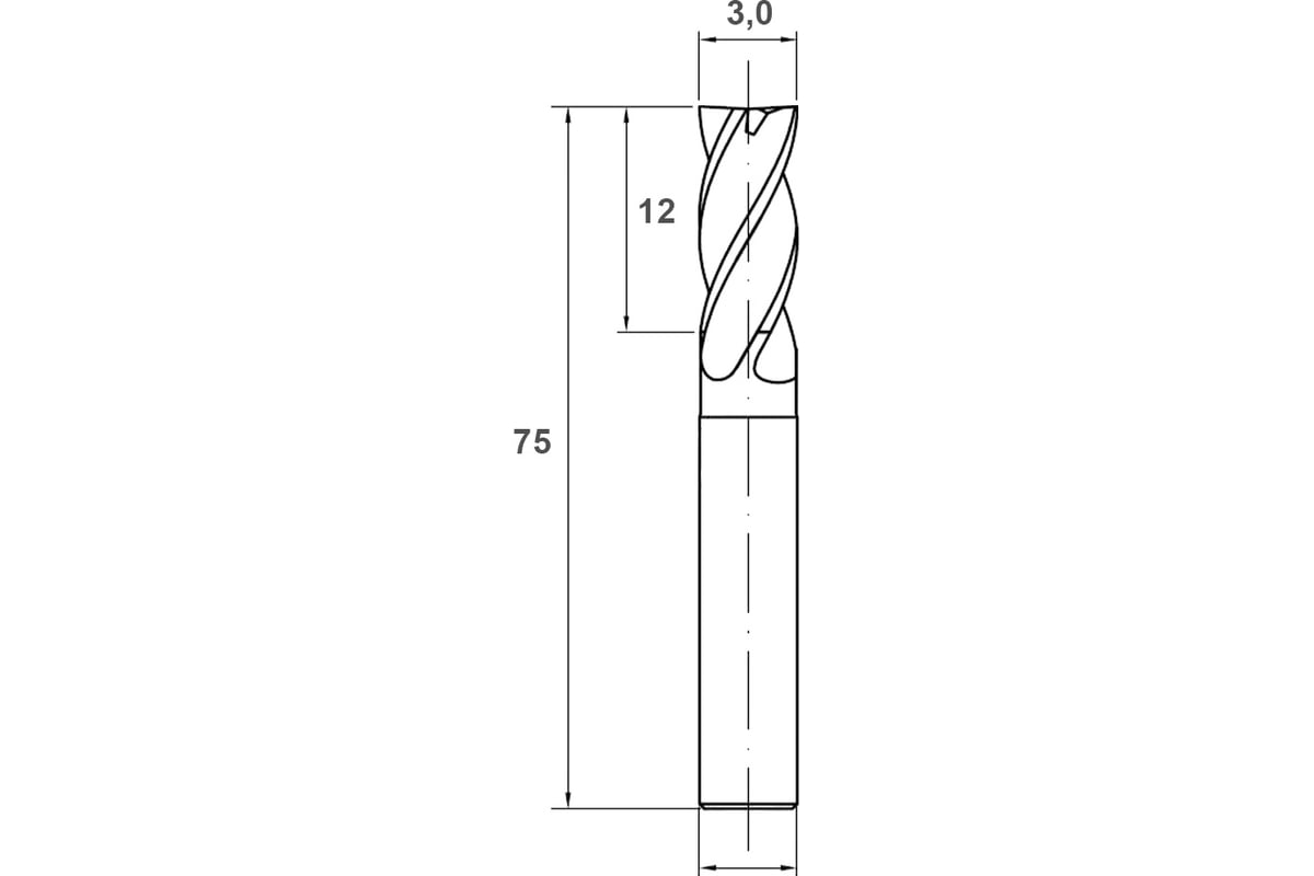 Фреза твердосплавная концевая по алюминию 3х12х3х75 мм, 55 HRC, с покрытием DLC, 3 зуба Гендеталь 3F375DLC55