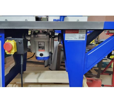 Мощный, подходит к фрезерному столу Белмаш, правда у меня потребовалась небольшая доработка - подошва фрезера шире расстояния между рёбрами жёсткости стола, толщины шайб комплекта не достаточно. Немного подрезал подошву. Ставить ещё дополнительные шайбы не стал, установить родные под столом ещё тот квест. Возможно дефект стола.