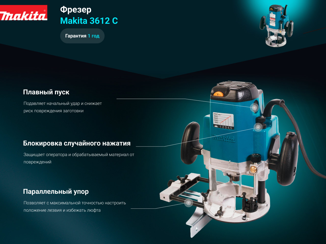 Фрезер Makita 3612 C - это мощный инструмент профессионального класса. С его помощью на производствах делают фигурные пазы, кромки, фаски. От царапин на материале заготовок защищает опорная платформа из литого алюминия. Встроенная электроника делает работу с инструментом более удобной, она поддерживает постоянное число оборотов и снижает вероятность получения травмы. Прозрачный щиток, расположенный внизу инструмента, и возможность подключения пылесоса способствуют сохранению рабочего места в чистоте.