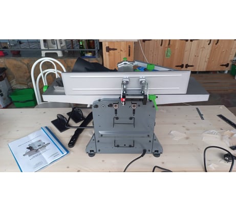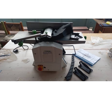 Пишу отзыв сразу после покупки и настройки. 1.Столы ровные и вдоль и поперёк и по диагонали. 2.Из коробки подвижный стол был установлен с наклоном к ножевому валу. Подробнее: стол крепится 4-мя болтами через стальные втулки с квадратным фланцем (ползунком), которые движутся в прямоугольных отверстиях корпуса. Перекос был устранён перестановкой втулок (вынимаются свободно), видимо геометрия не точная, но подтачивать ничего не пришлось. 3.Подвижный стол слегка люфтит в посадочных отверстиях (можно подложить шайбы с большим отверстием или подточить фланец втулок до толщины корпуса и фиксировать жёстко, но тогда придётся ослаблять болты при регулировке толщины съёма). 4.Люфтит по оси на 1мм шкив привода автопротяжки рейсмуса, нужно шайбу подобрать, иначе цепляет ось соседней шестерни. 5.Не протянуты ножи с завода, будьте осторожны перед первым включением (были затянуты только крайние болты). 6.Шум для коллекторного двигателя приемлемый, без наушников работать можно. В общем за свои деньги годный станок, разочарования в качестве нет, все косяки устранимы, не думаю что аналоги будут лучше.