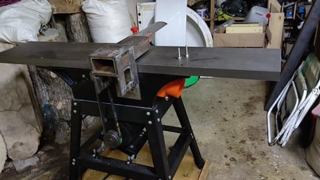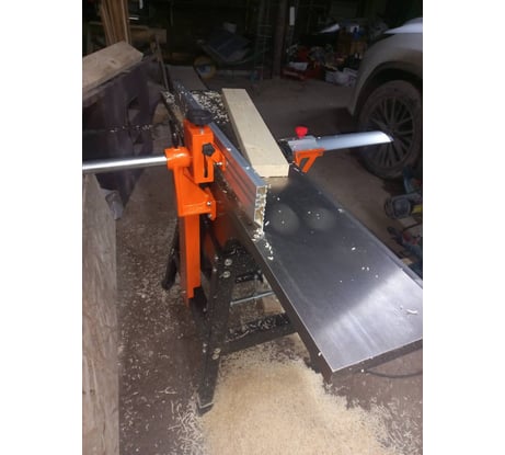 Выбирал станок долго. Остановился на этом. Литые чугунные столы, асинхронный двигатель, цена. Станок продается в сборе, нужно собрать подставку с двигателем, установить параллельный упор. Решение сделать своего рада конструктор спорное. Но мне не составило собрать по схеме. Тем более нужно было затащить станок на чердак, поэтому разобрал и сам станок. Заодно оценил качество изделия. Приемный стол идеальный, подающий имеет горб в середине 2-3 десятки. Подшипники на валу шумят прилично, да и смазки было очень мало. Когда собирал подставку, то болты вставил изнутри. Немного не эстетично, зато крутить легко и регулировать по уровню проще. Метизы конечно под замену. Квадрат на болтах больше чем толщина стальных пластин, в результате затянуть без дополнительных шайб не получится. А их нет. У трех сорвал резьбу. Клеммы проводов отвалились при установке - пришлось припаять. Сначала поставил два ремня, но они крутятся с разними скоростями как видно по нанесенной маркировке. В результате за минуту шкивы сильно нагрелись. Пришлось один снять, второй в запас. Если не драть на всю ширину на 4 мм, то будет нормально. Именно драть, а не строгать. Где заявленные 4000 об/мин? Двигатель 2800, а шкивы одинаковые. Мотор сильно гудит. Похоже стартерная обмотка не отключается после пуска. За 15 минут работы движок нагрелся, не сильно. Может кстати и вибрация сильная из-за этого. Но это не точно. Параллельный упор, конечно не выдерживает критики. В общем порадовал себя покупкой. Будет чет заняться на досуге.