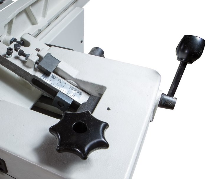 Регулировка наклона фуговального упора Рычажная регулировка контролирует наклон упора размерами 968 х 120 мм на 45 градусов в обе стороны. |