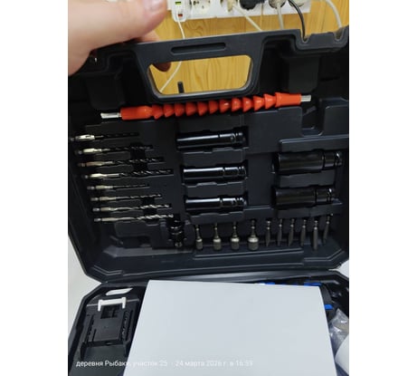 Удобство хранения. Поставляется с комплектом, включающим зарядное устройство 230В/50Гц, набор головок, бит, сверл и гибкий удлинитель, упакованных в практичный кейс для хранения и транспортировки.