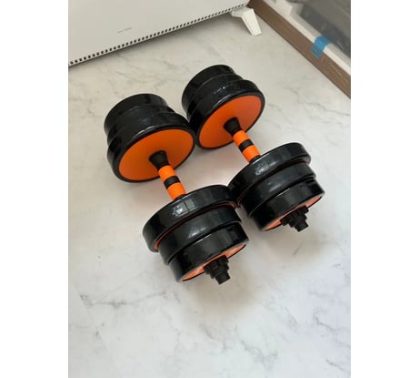 Классные гантели: хват удобный, покрытие не скользит, цвет бодрит :) На вид прочные, пластик не ломается, диски держатся плотно. Идеально для домашней тренировки, особенно если хочется яркий аксессуар.