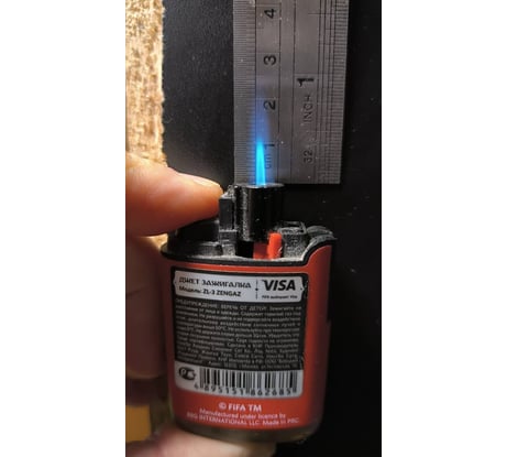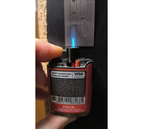 Взял на выходных, для заправки зажигалок. А то часто на улице нахожусь, и в холода многие зажигалки пока в руке не согреешь ни в какую не хотят гореть. Заправил этот газ (единственное переходник у меня отдельный валялся). Так вот сегодня весь день на морозе -24градуса, ни разу зажигалка не подвела. Каждый раз отлично срабатывал, зажигалку греть не приходилось. Еще когда только заправил, попробовал. Пламя на средней мощности было больше чем у аналогичной зажигалки на другом газе, причем вторая зажигалка была выкручена на максимум. Фото приложил, красная зажигалка на другом газе выкручена на максимум. Синяя на этом газе, мощность по середине.
