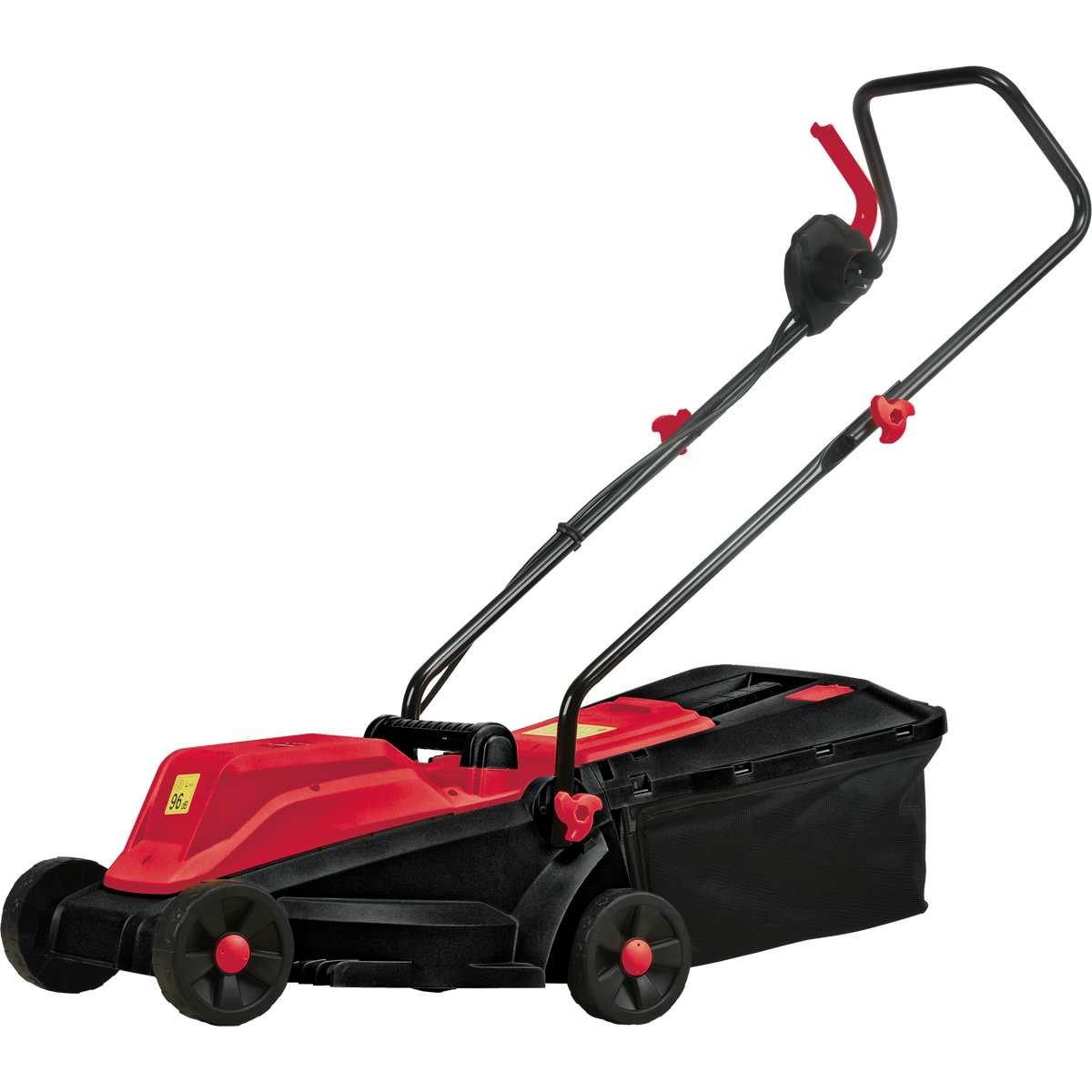 Вертикально расположенный однофазный коллекторный электродвигатель, шестерёнчатый редуктор и выходной вал с режущим ножом установлены в пластиковом корпусе. Конструкция ножа позволяет срезать траву и создаёт поток воздуха, для выброса срезанной травы назад или в установленный травосборник. Высота среза регулируется ручной переустановкой осей с колёсами в три фиксированных положения по высоте (25-45-60 мм) от поверхности земли. Блок управления (вилка для подключения сети и рычаг включения двигателя с кнопкой блокировки) закреплён справа на рукоятке управления.