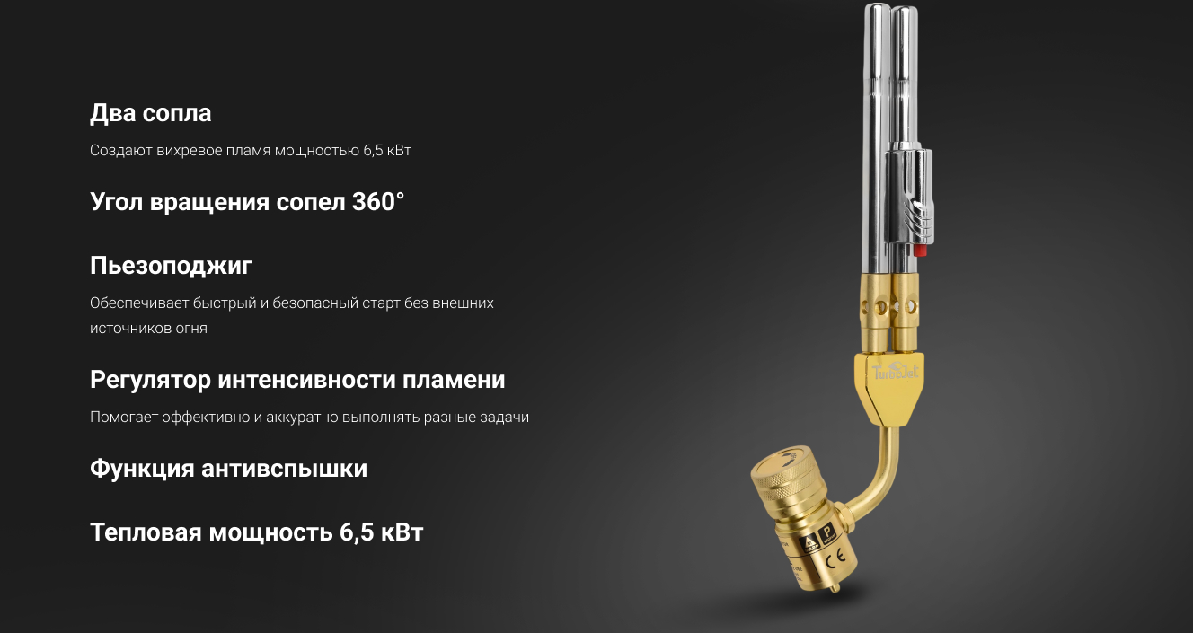 Способна подавать очень высокую температуру в труднодоступные места и производить пайку медных труб с диаметром до 50 мм.