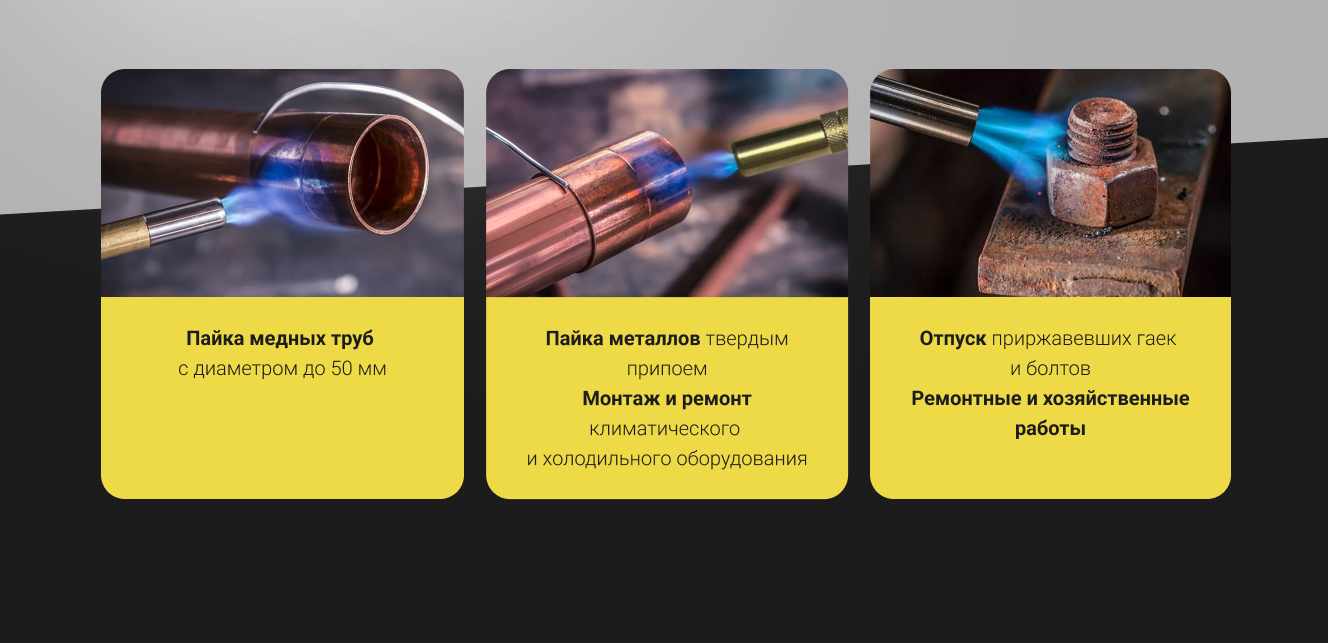 Основным назначением данной модели является пайка при монтаже и ремонте климатического и холодильного оборудования, пайка металлов твердым припоем. Может применяться для обжига деревянных конструкций, отжига приржавевших болтов и гаек.