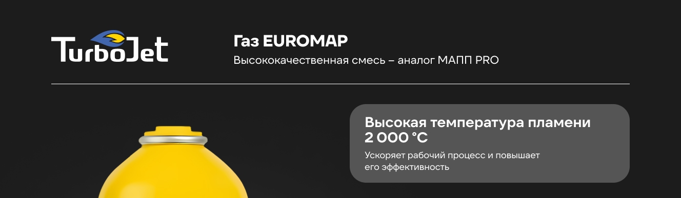 Газовый баллон Turbojet EUROMAP, TJ750GA представляет собой одноразовый резьбовой баллон со смесью газов EUROMAP (аналог MAPP газа, новая, усовершенствованная формула).