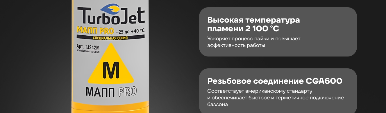 МАПП-газ — смесь сжиженных нефтяных газов. Mapp-газ имеет высокую температуру сгорания, при которой можно резать, варить, паять. В процессе работы с горелками на МАПП-газе температура пламени достигает 2100°C, что на 33-35 % эффективнее, чем у пропана. Отличительной особенностью МАПП-газа является возможность работы при низких температурах. Этот газ экономичнее прочих газов в 2 раза, к тому же способен обеспечить ровное пламя при любом уровне газа в баллоне.