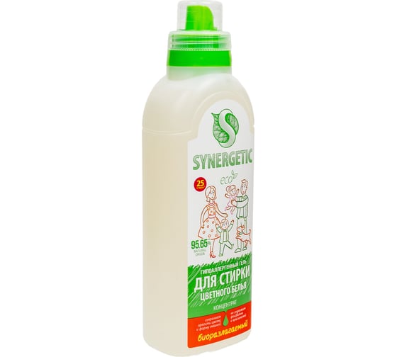 Гель для стирки цветного белья SYNERGETIC 750 мл 4607971450054 109753 предназначен для использования в стиральных машинах любого типа и ручной стирки при температуре 20-90 °C. Уникальный комплекс растительных тензидов, натурального мыла и зелёных хелатов обеспечивает бережное и эффективное очищение цветных тканей. Функциональные добавки предотвращают повторное оседание загрязнений на ткани, сохраняя её первоначальный вид, насыщенность цвета, прочность и структуру. Биоразлагаемый гель безопасен для природы и человека. Не содержит красителей, фосфатов, фосфонатов, ЭДТА и агрессивных ПАВ. Полностью выполаскивается из тканей. Биоразлагаемые компоненты не вредят микрофлоре септических установок.
