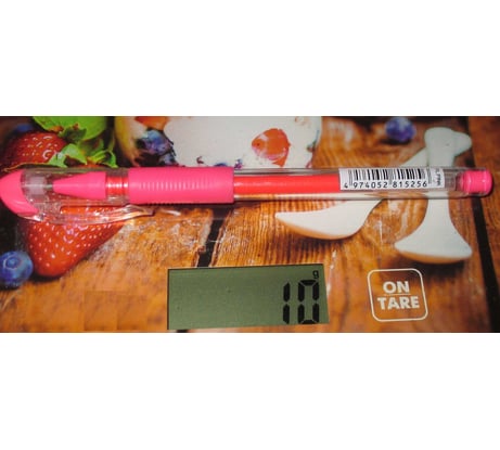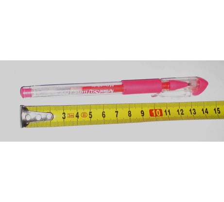 Гелевая ручка с измеренной массой 10 гр. Измеренная длина с колпачком 14.5 см. Имеет приличную емкость стержня с чернилами, выглядит симпатично. Пишущий узел чрезмерно тонкий, позволяет экономить чернила, но не всех видах бумаги пишет уверенно, рыхлую бумагу царапает. В целом для своей стоимости неплохо.