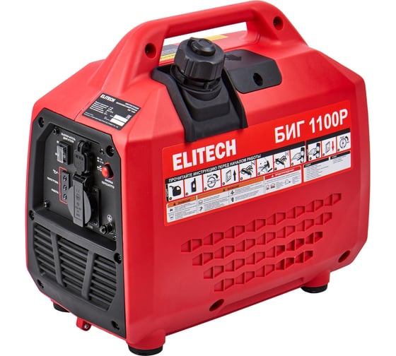 Инверторный генератор ELITECH БИГ 1100Р номинальной мощностью 1 кВт (макс. 1,1 кВт) с 4-х тактным бензиновым двигателем предназначен для работы в качестве автономного источника электроэнергии переменного однофазного тока напряжением 230В, частотой 50Гц. Генератор снабжен одной розеткой на 16 А и двумя выходами USB: 5В/1А, 5В/2,1А.