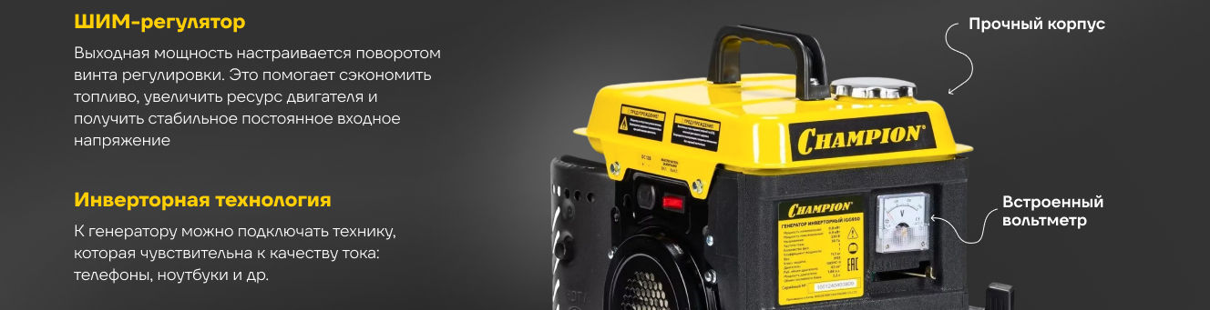 Генератор CHAMPION IGG950 представляет собой надежное оборудование, которое служит в качестве источника резервного энергоснабжения. Благодаря небольшим габаритам и весу модель незаменима на отдыхе за городом, в походе или на даче. Для удобства и легкости транспортировки в конструкции аппарата предусматривается наличие ручки эргономичной формы. Опорные ножки выполняют роль демпферов, что гарантирует низкий уровень вибраций во время работы.