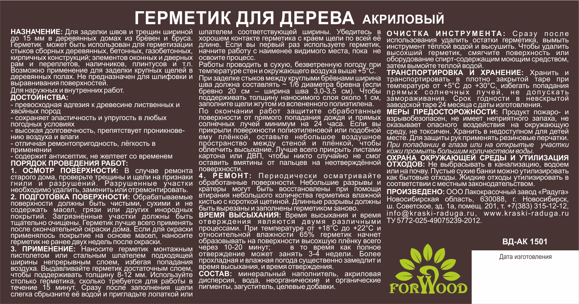 Герметик для дерева Forwood ВДАК-1501 сосна, 14 кг 141287 предназначен для герметизации межвенцовых швов и щелей рубленых домов, а также для заделки торцевых и боковых трещин на бревнах и брусе. Для наружных и внутренних работ.