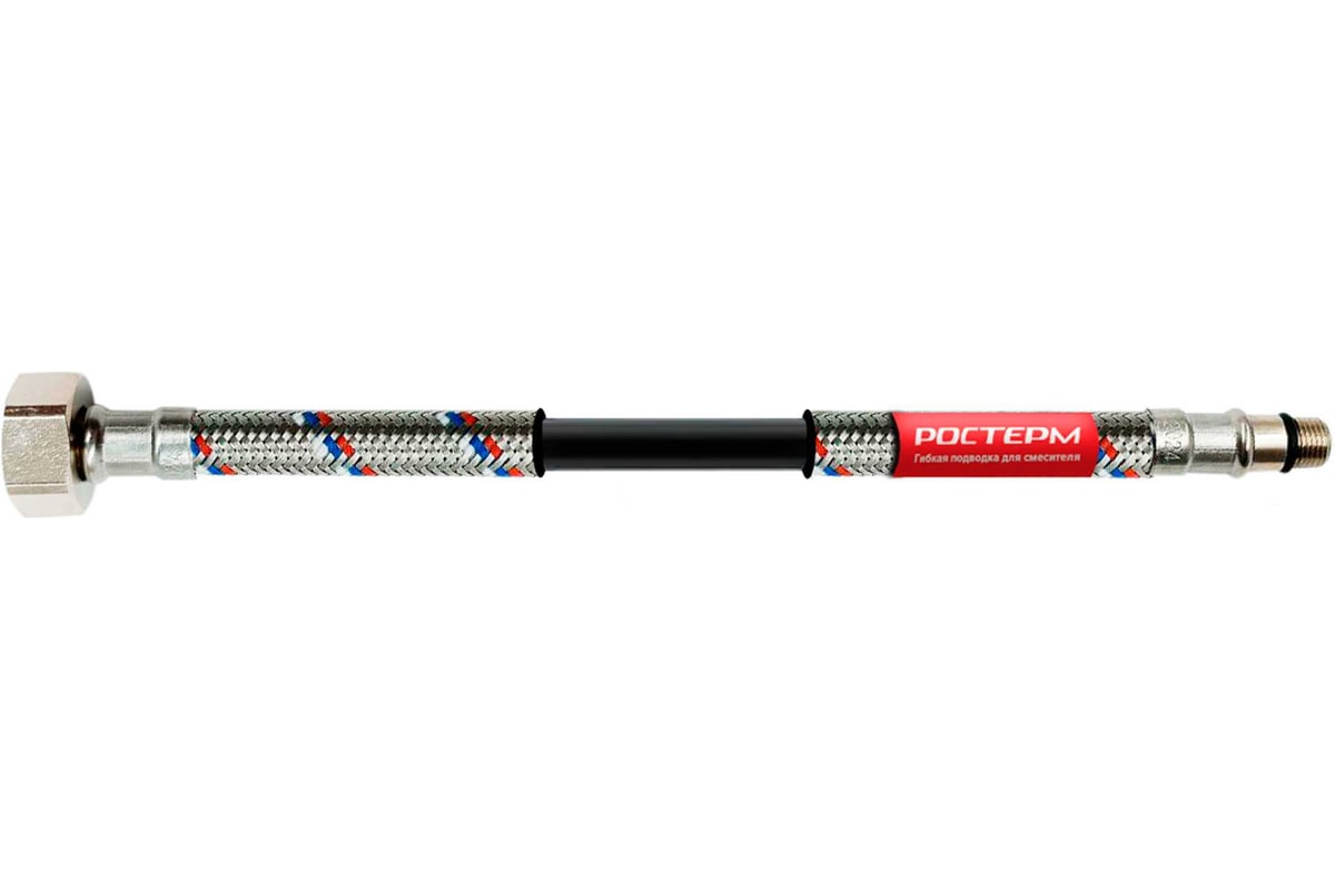 Гибкая подводка для смесителя РОСТерм – надёжное решение для комфортного подключения смесителей к системе водоснабжения. Оплетка выполнена из нержавеющей стали с вкраплениями белых, красных и синих нейлоновых нитей, что характеризует использование в горячем и холодном водоснабжении.