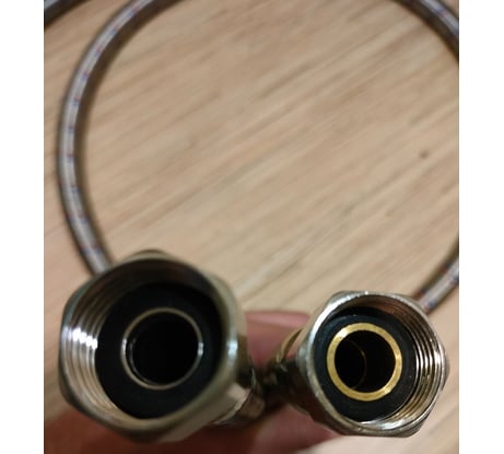 Внешне, подводка ЦС ГИГАНТ 19, 1/2"Г х 1/2"Г, L80см, выглядит надёжной. Немного смущает разный материал и разная толщина стенок трубок с двух сторон у одной подводки (см.фото).