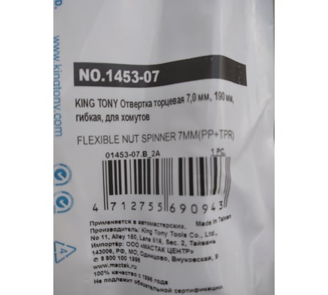 Гибкая торцевая отвертка для хомутов 7мм, 300мм, KING TONY 1453-07