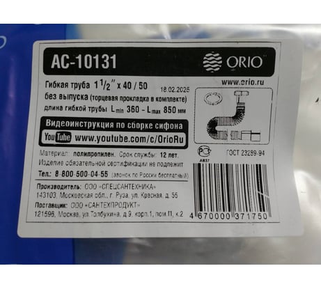 Гибкая труба ORIO 1 1/2x40/50 максимальная длина 850мм АС-10131 На страницу товара149 ₽