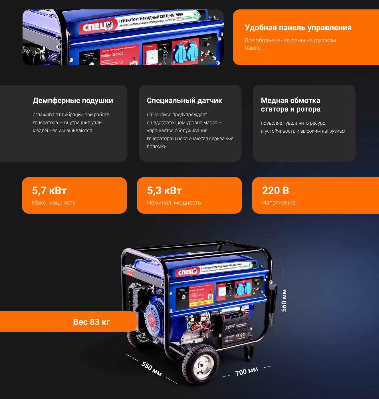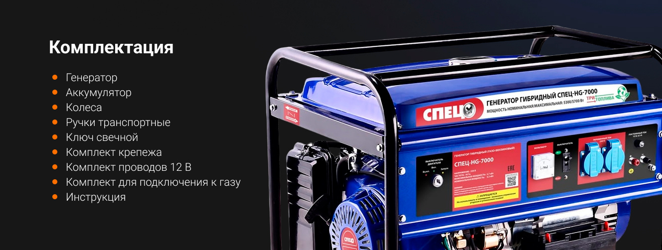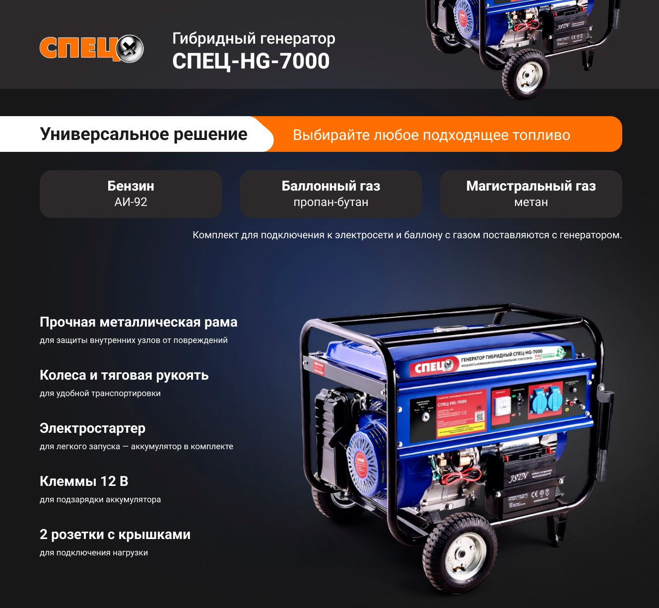 Гибридный генератор газ-бензин СПЕЦ-HG-7000 и комплект для подключения к сети+баллону предназначается для снабжения бытовых приборов или инструментов электричеством на даче, в домашней мастерской. Все элементы устройства крепятся на жесткую металлическую раму, которая образует две ручки для удобства транспортировки. В комплект поставки входят колеса для простоты перемещения по ровной рабочей площадке. Двигатель агрегата запускается про помощи ручного или электростартера.