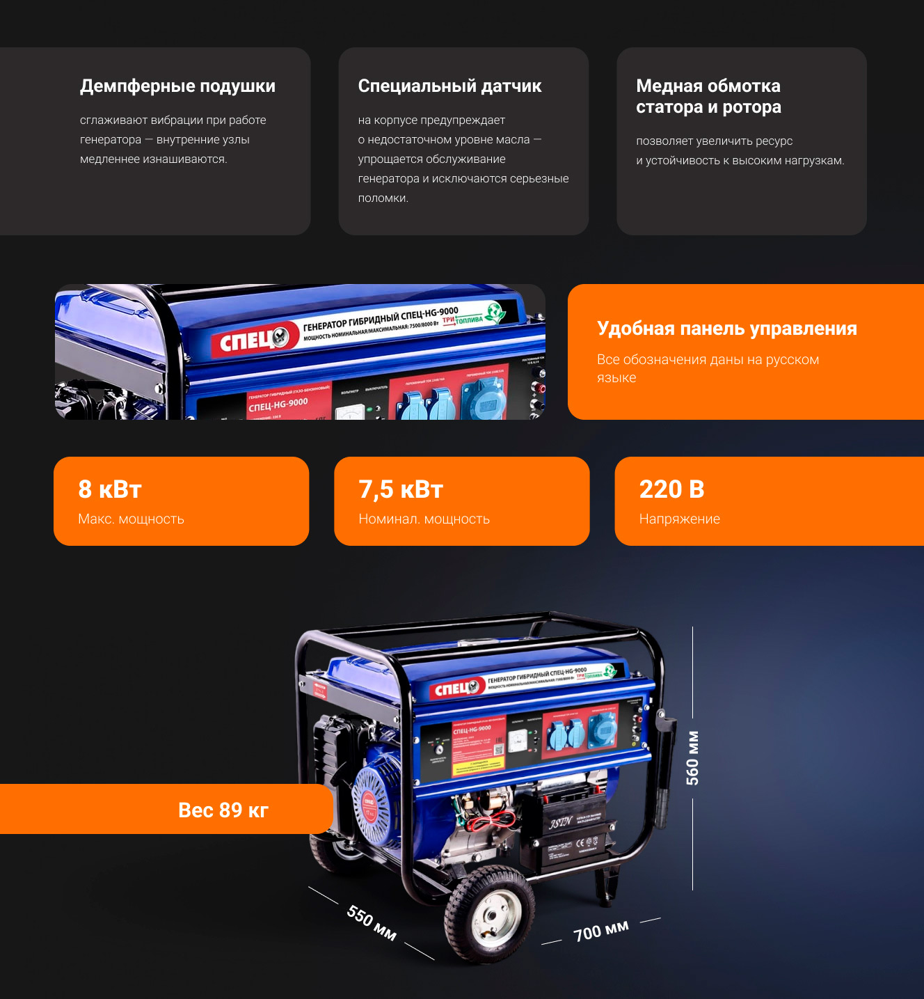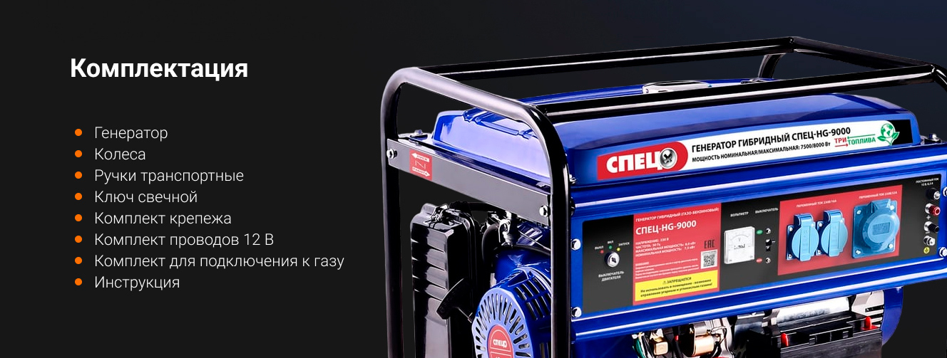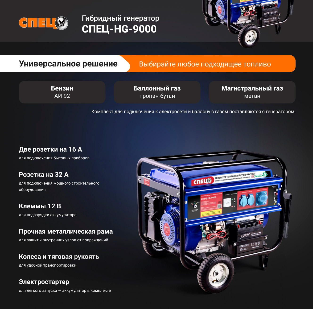 Гибридный генератор газ-бензин СПЕЦ HG-9000и комплект для подключения к сети+баллону предназначается для снабжения бытовых приборов качественным электричеством. Предусматривается розетка на 32 А для подключения высокомощного строительного оборудования. В качестве топлива используется не только бензин АИ-92 и сжиженный газ в баллонах (пропан-бутан), но и магистральный газ (метан). Все элементы генератора крепятся на жесткую металлический раму, которая имеет ручки и колеса для удобство перемещения по рабочей площадке.