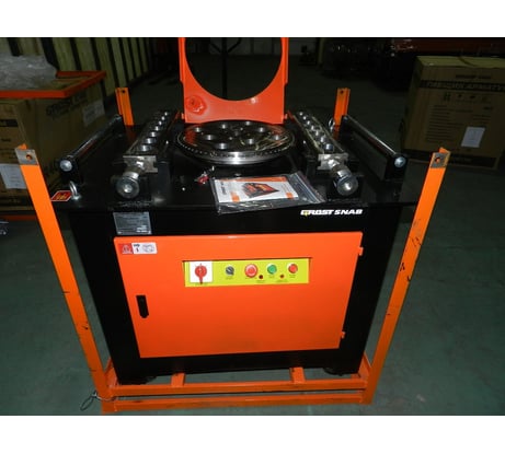 Гибщик арматуры Grost SNAB G50 212156 используется на заводах по производству железобетонных изделий, в специализированных арматурных производствах, на строительных объектах, при производстве фундаментов, в домостроительных комбинатах. Станок имеет 2 концевика, настройка каждого угла гибки осуществляется с помощью пальцев, устанавливаемых по краю планшайбы