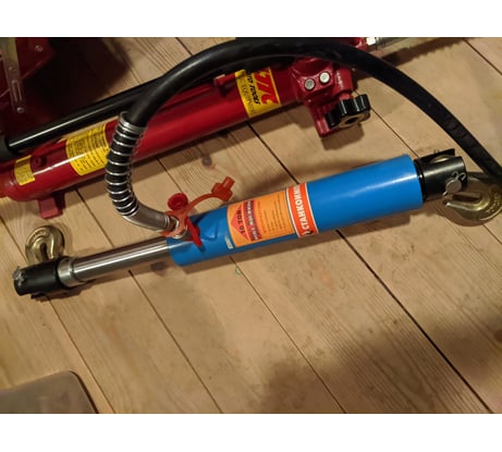 Хотелось бы слегка больше хода штока, но конструкция типовая, ничего не поделать. Крюки-укоротители сразу в комплекте, их можно как поменять на вертлюги и другое, так и открутить полностью. Предел нагрузки пока не испытывал, нет таких задач, с рабочими моментами справляется на раз. Работает в паре с НВ600, которого хватает на 10 тонн в прессе, хотя стяжку, повторюсь, пока максимально нагрузить было нечем.