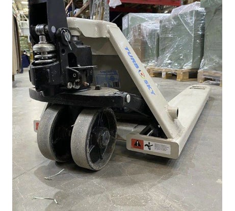 Перемещаем тяжёлые паллеты на ура, гидравлика плавная, подъем ровный. Колеса прочные, маневрировать удобно
