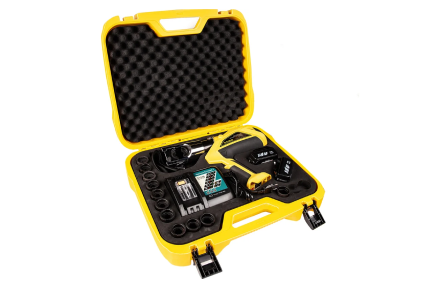 Гидравлический аккумуляторный пресс для обжима наконечников 16–400 мм² Car-Tool CT-16400U. Профессиональный аккумуляторный гидравлический инструмент для обжима кабельных наконечников, гильз и муфт в диапазоне от 16 до 400 мм². Оснащён мощной гидросистемой с усилием 11 т и аккумулятором 18 В / 4,0 А·ч, обеспечивающим автономную работу на объекте.