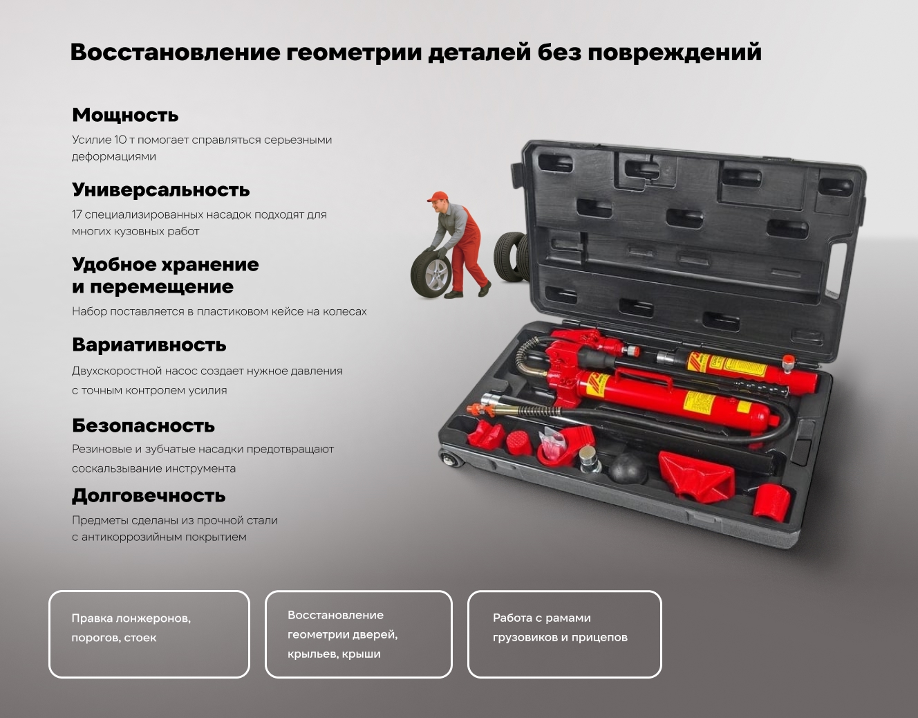 Гидравлический набор для кузовных работ (усилие 10т, 17 предметов) JTC-HB210 широко используется профессионалами кузовного ремонта, как локального (удаление вмятин, царапин и потертостей, ремонт пластиковых деталей, бамперов и т.д.), так и полного (выправка нарушенной диагонали автомобиля, замена конструктивных элементов и др.). Данный набор отличается оптимальной комплектацией, и станет отличным помощником в любой автомастерской. Все устройства и мелкие приспособления выполнены из качественного материала.