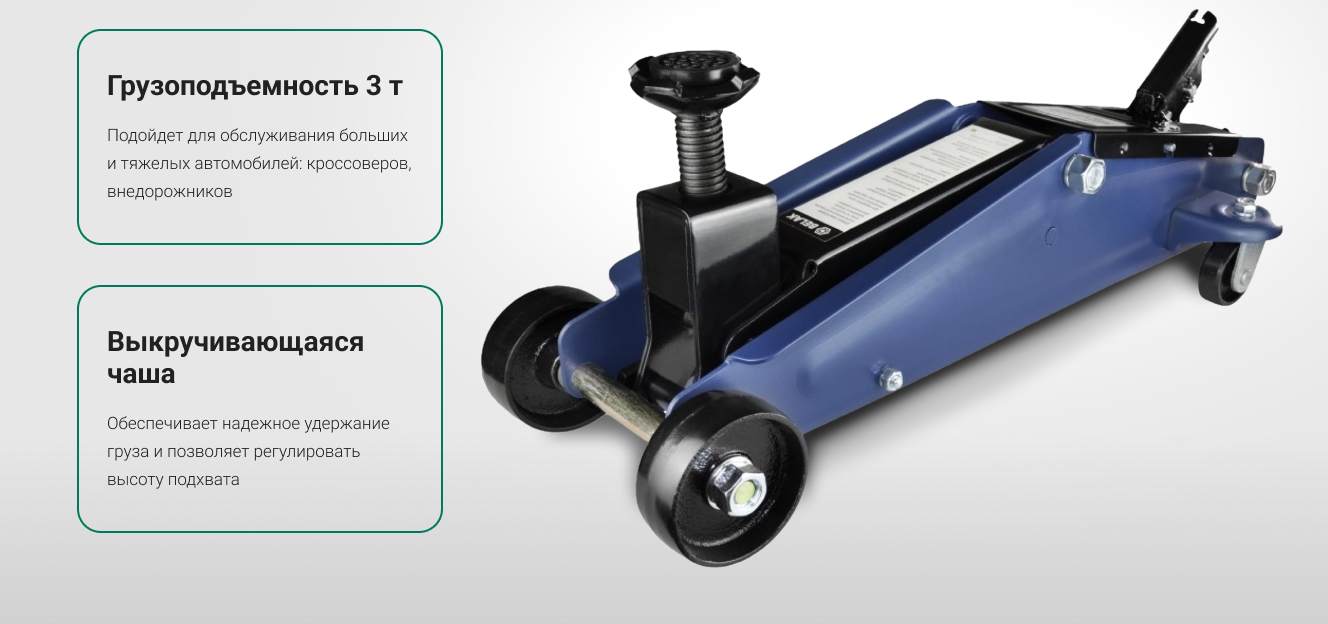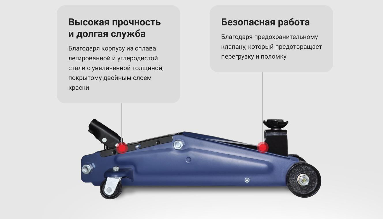 Предохранительный клапан обеспечивает повышенную степень безопасности и защиту от перегрузок. Прорезиненная рукоять поможет вам с комфортом и лёгкостью поднимать груз.