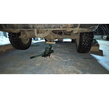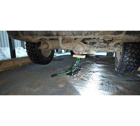 Ниву поднял за задний мост без усилий. Домкрат тяжёлый, метал толстый, пятка крепкая.
