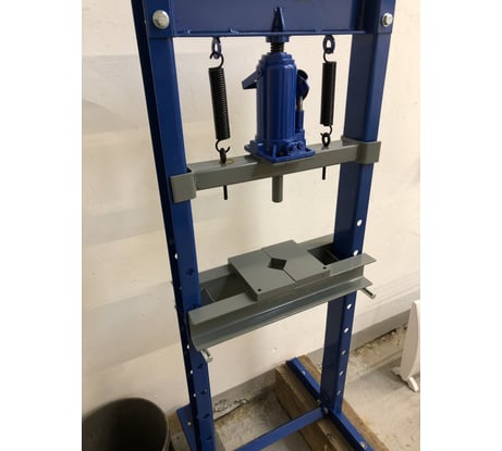 Верхний упор домкрата приварен не по центру. Отверстия для крепления домкрата так же просверлены криво. А сам домкрат это отдельная песня. Изначально шток поднимался процентов на 30, логично что в него попал воздух, тк транспортировка бутылочного домкрата допускается только вертикально. Пробовал прокачать - без успешно. Слил с него масло, а там всего грамм 50. Залил масло для гидроусилителя (влезло конечно больше). + к этому подтекал стравливающий краник. Выкрутив его обнаружил, что сальник рваный и изготовлен из дубовой резины. Пришлось подбирать из того, что нашел в гараже. Спустя час ремонта нового пресса им стало возможным использование.