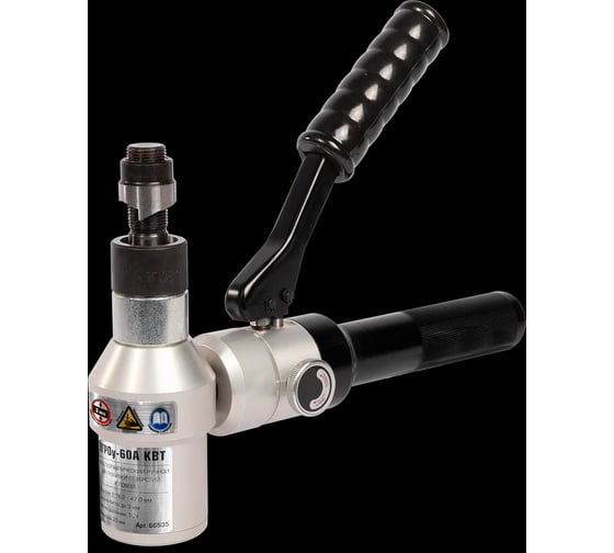 Гидравлический ручной угловой пресс для пробивки отверстий КВТ ПГРОу-60А 66535 оснащается рабочей головой с функцией поворота на 360 градусов. В качестве оснастки используются перфоформы (матрица+пуансон) 8 вариантов размера, которые позволяют пробивать отверстия диаметром 16.2, 18.6, 20.5, 22.5, 25.4, 28.3, 37 или 47 мм. Корпус агрегата выполнен из жесткого и прочного материала - алюминиевого сплава.