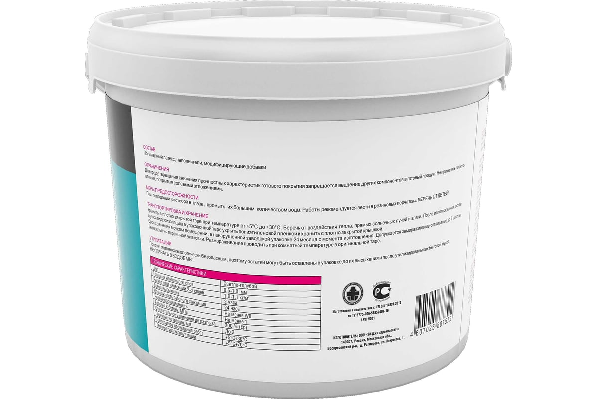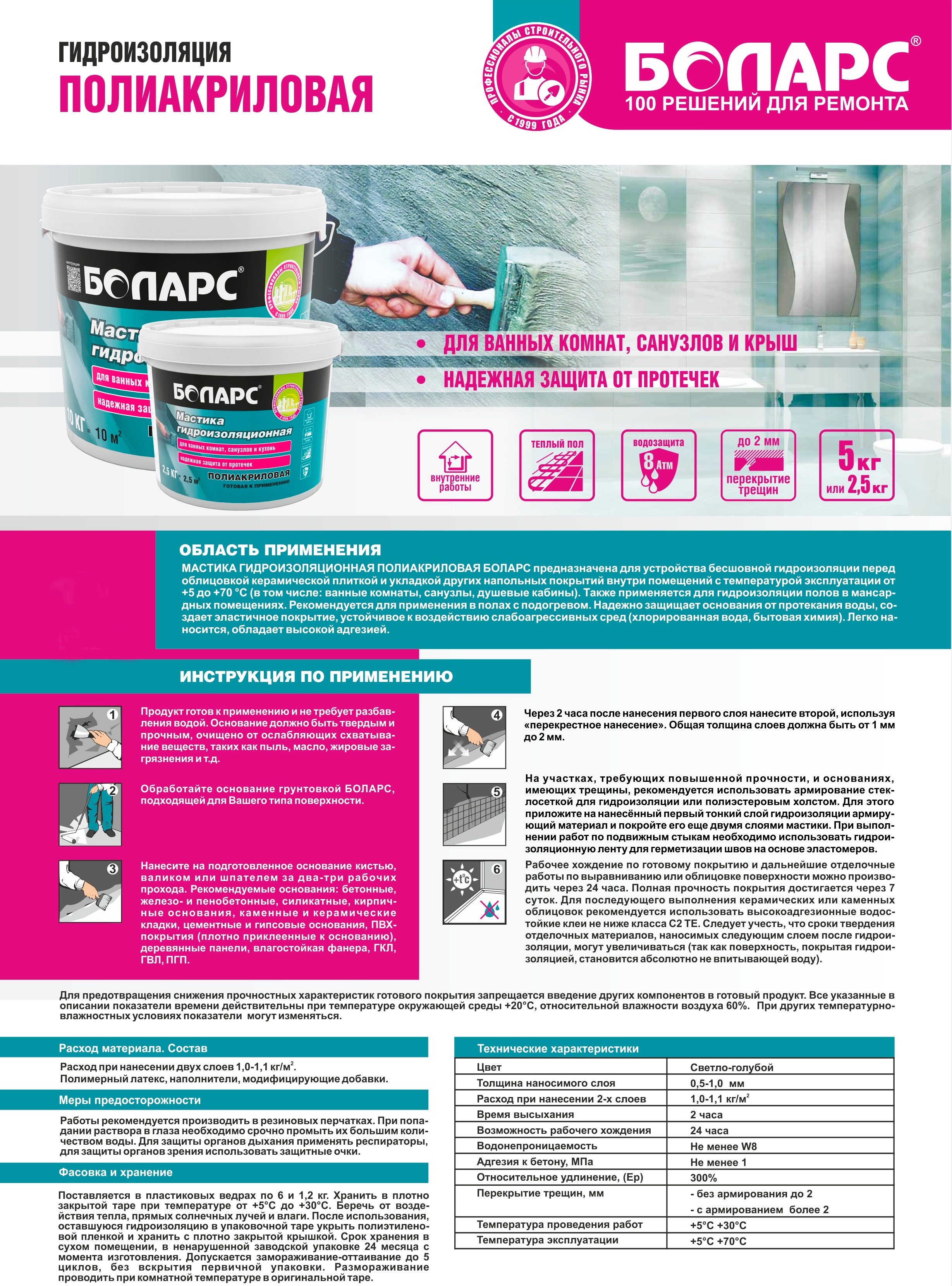 Гидроизоляционная мастика БОЛАРС полиакриловая, 5 кг 00000039059 предназначена для устройства бесшовной гидроизоляции перед облицовкой керамической плиткой и укладкой других напольных покрытий внутри помещений с температурой эксплуатации от +5 до +70 градусов (в том числе: ванные комнаты, санузлы, душевые кабины). Также применяется для гидроизоляции полов в мансардных помещениях. Рекомендуется для применения в полах с подогревом. Надежно защищает от протекания воды. Создает эластичное покрытие, устойчивое к воздействию слабоагрессивных сред (хлорированная вода, бытовая химия). Благодаря составу, продукт легко наносится и обладает высокой адгезией.